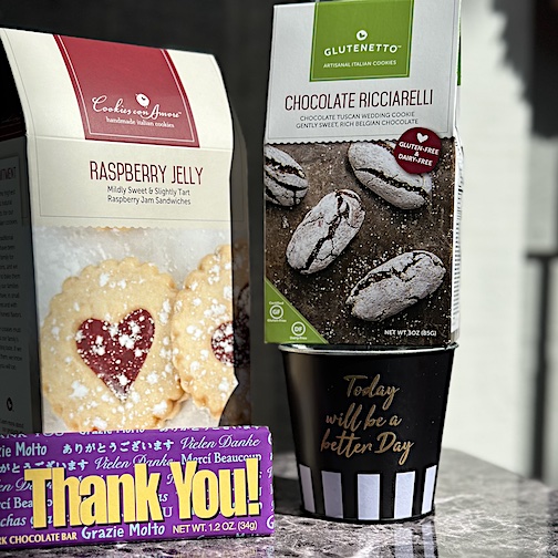 This box comes with Raspberry Jelly Heart cookies, and Chocolate tuscan wedding cookies with rich Belgium Chocolate! You are also sending a pail of encouragement "This will be a better day" and a Chocolate Thank You Bar. Something like this will make their day!