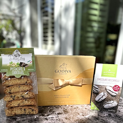 Absolutely the best of the best! An incredible assortment of Godiva Chocolates, including Chocolate Ganache (my favorite), along with a special chocolate and pistachio biscotti from Italy and Chocolate tuscan wedding cookies with rich Belgium Chocolate! So yum!