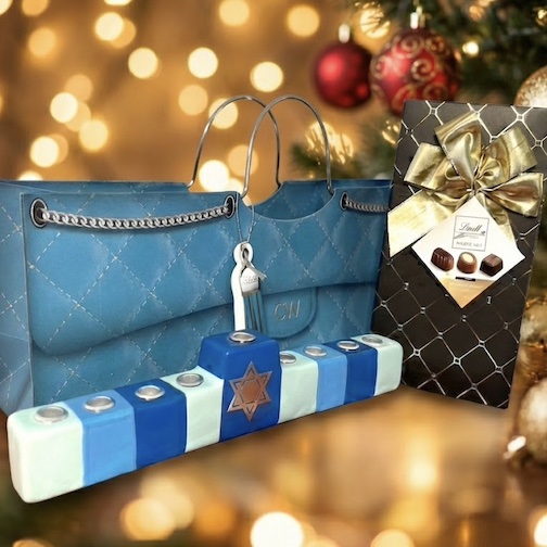 You are sending a Chanukah Menorah and Belgium Chocolates in a very cute paper purse. We are adding a simple snowflake tablecloth just right for the kids table. The adults get the rest. Perfect for the holidays!