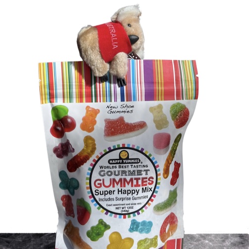 This cute little Aussie Bear loves this big beautiful bag of Happy Day Gummies! It's a great gift!